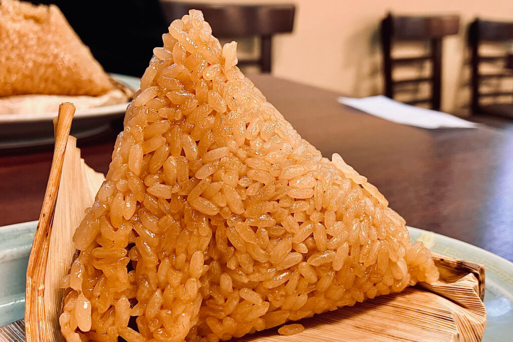 味付けされた餅米は、程よく芯が残っていて歯応えがある。食べ進めていくと、うずら卵や豚肉が現れて最高のハーモニーを奏でてくれる。