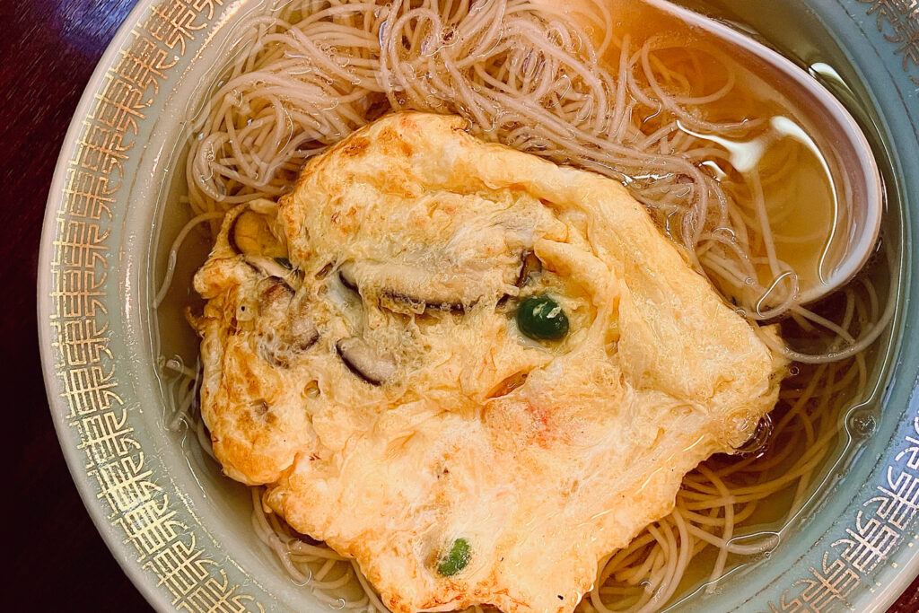 気の良い店員さんの案内で、一番奥のテーブル席へ。オーダーは並んでいる最中に決めておいた。僕は「並ビーフン・焼」、妻は「蟹玉ビーフン・スープ」、さらに二人とも「バーツァン(中華ちまき)」も注文した。