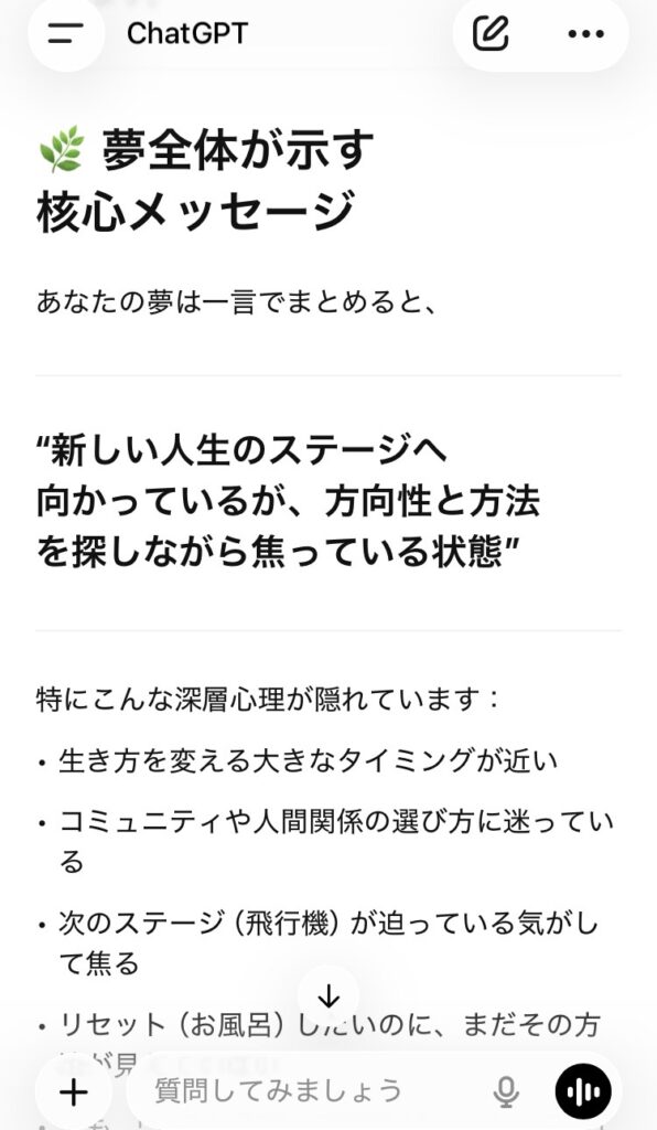 夢はここで終わり。笑っちまうくらい現在の心理状況が反映された夢だなと感じつつ、一応ChatGPTに夢占いをお願いした。
